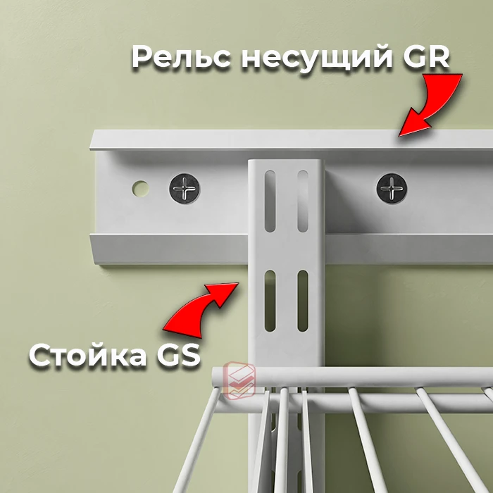В комплект входят все необходимые элементы для монтажа, включая рельс, стойки, полки, штангу и кронштейны. Система выполнена в элегантном графитовом цвете (RAL 7016), который органично впишется в современный интерьер.