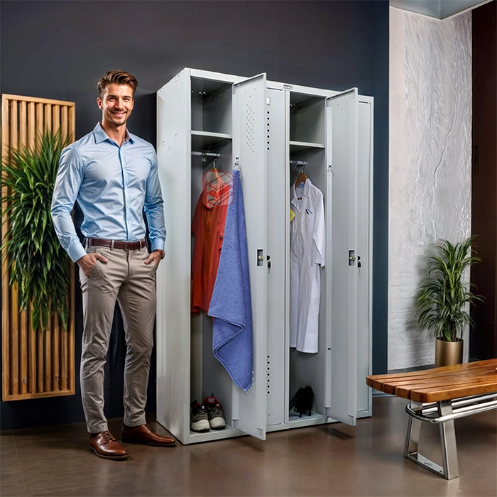 • Просторные секции: Шкаф разделен на четыре независимых отсека, что позволяет эффективно организовать хранение вещей нескольких пользователей.