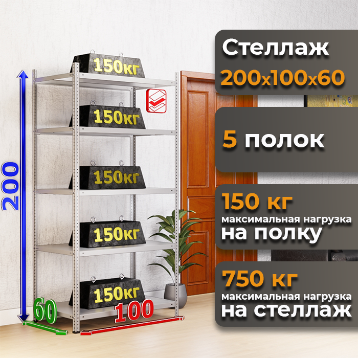 • Надежность: Каждая полка выдерживает нагрузку до 150 кг, общая грузоподъемность стеллажа – до 750 кг.