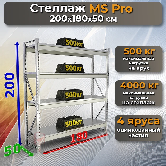 Гаражный стеллаж MS Pro 200х180х50 с 4 полками — универсальное решение для организации хранения в гараже, на складе или в кладовой.