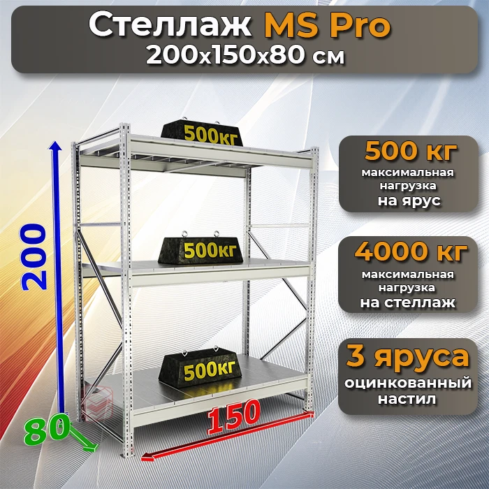 Стеллаж складской MS Pro 200х150х80 3 яруса - надежный и прочный металлический стеллаж MS Pro предназначен для организации хранения на складе, в гараже, кладовой, торговой точке или на производстве.